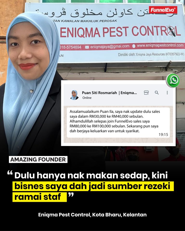 Dari supervisor stesen minyak, kini saya mampu bina Eniqma Pest Control menjadi syarikat pest control yang lebih sistematik dan berkembang. Semuanya bermula dengan keberanian ambil risiko, dan kesungguhan belajar ilmu digital.