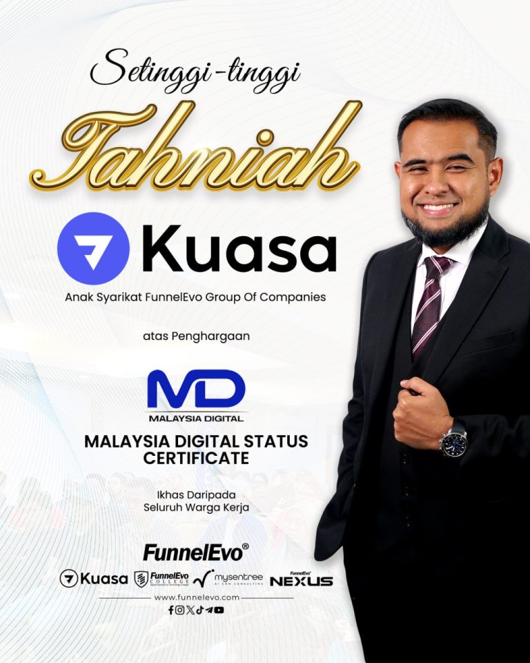 FunnelEvo Group of Companies merakamkan ucapan setinggi-tinggi tahniah kepada KUASA, anak syarikat rasmi di bawah kumpulan ini, atas penganugerahan Sijil Pengiktirafan Malaysia Digital Status oleh Malaysia Digital Economy Corporation (MDEC).